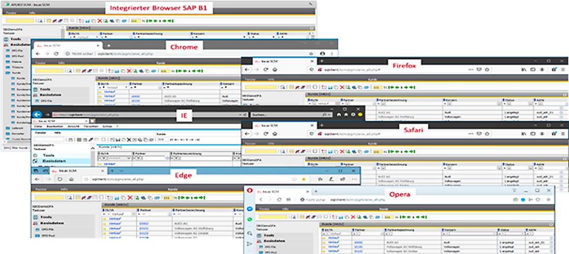 In dieser APLIKO SCM Version werden der integrierte SAP Browser, Chrome (44,17%), Firefox (25,50%), Internet Explorer (9,06%), Safari (8,78%), Edge (7,49%) und Opera (3,91%) unterstützt und validiert.